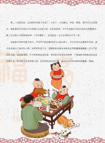 第三,适量运动,运动的好处就不多说了,太多了,不过建议,中饭,晚饭,饭后可以适量散