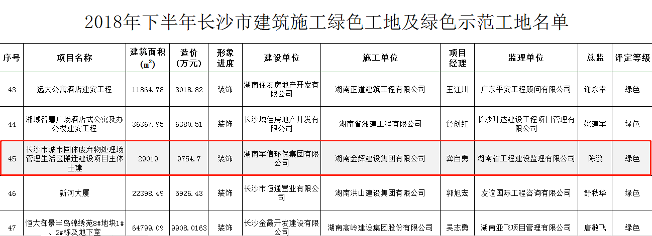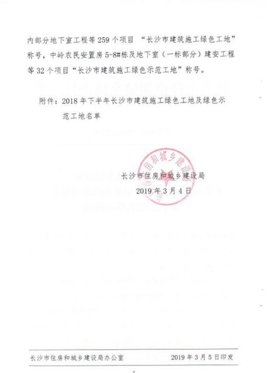 在03月06日长沙市住房和城乡建设局公告的长住建发{2019}22号文《关于公布2018年下半年长沙市建筑施工绿色工地名单的通知》中,我公司承建施工的长沙市城市固体废弃物处理场管理生活区搬迁建设项目主体土建工程荣获“2018年下半年长沙市建筑施工绿色工地”。